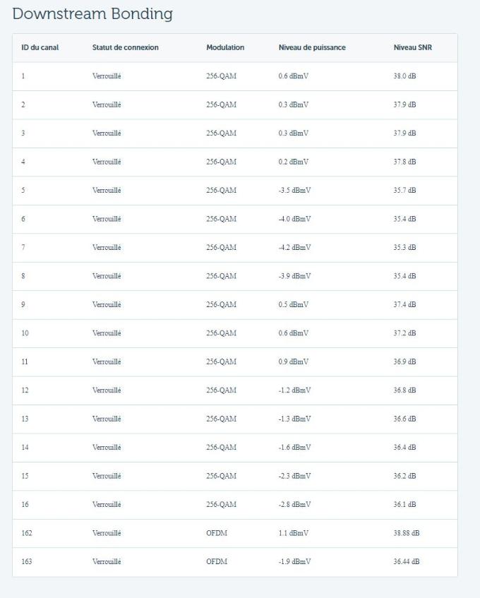 J'en arrive donc à la conclusion qu'il y a un soucis soit avec le routeur, soit avec la ligne en elle-même. Pourriez-vous regarder ce qu'il en est de votre côté ? Ci-dessous, mes valeurs DOCSIS et un speedtest, le tout capturé pendant un moment où le problème était présent.