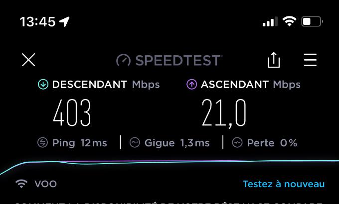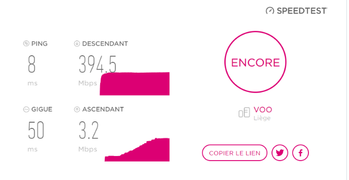 Voilà j'ai effectué un speedtest sur le site de voo et le résultat confirme mon problème. Ma vitesse en upload est de 0,5 mbps avec une perte de paquets. Normalement, la vitesse doit être de 20 mbps. Pouvez-vous m'aider ? Merci