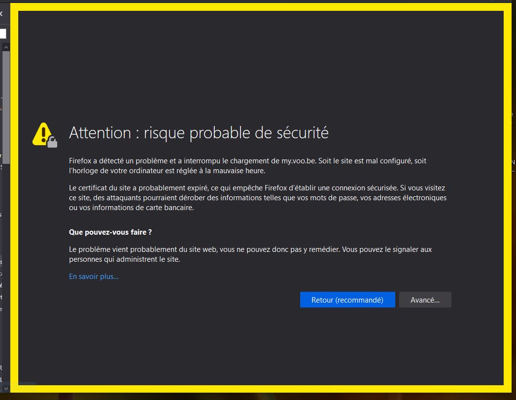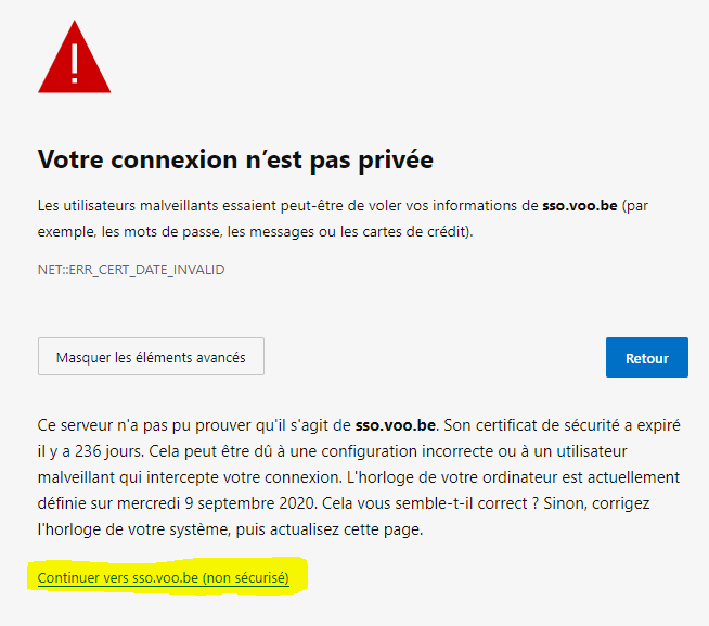 Mais cela ne m'empêche pas d'atteindre le site, il suffit de poursuivre en cliquant sur "avancé" puis sur "continuer vers sso.voo.be"